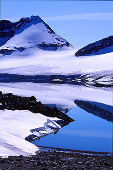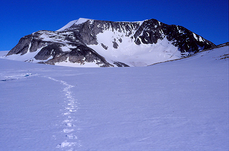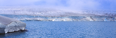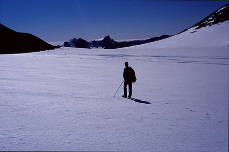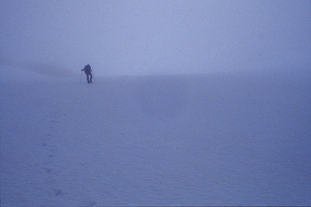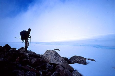 On a enfin pu mettre le nez dehors pour une belle journée de 9 heures de marche. Lente montée dans un névé jusqu'au col "des deux génies" qui nous ouvre la vue sur l'inlandsis qui vient s'écarteler sur un gros mamelon qui culmine à 1700m. C'est un sacré belvédère sur le 2086 qui a bien du mal à s'extirper des nuages. Ils passent au-dessus de nos têtes à toute vitesse. Le but de leur course folle semble être le 2086 et ils restent là. On ne le verra jamais en entier... On tentera bien une timide approche. Mais, arrivés à son pied, on n'insistera pas aujourd'hui. La météo n'est pas sûre, il est déjà 14h et ce serait dommage d'y aller dans le brouillard.