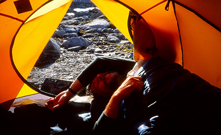 Retour au camp vers 19h et on embraye sur le repas pris sous un spectacle flamboyant de nuages rouges sur la pointe est du lac. Ils embrasent les glaciers et la neige. Replis sous la tente avec Boro et la guerre d'Espagne.