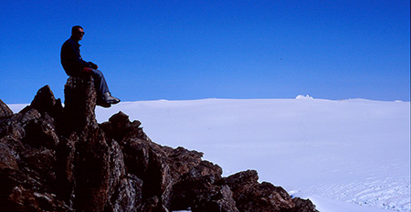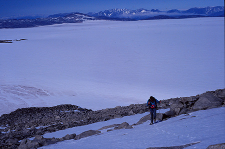 Départ du camp à 7h45. On se prend le front de la calotte à l'assaut. La neige est dure et craquante, un vrai régal pour les pieds et l'allure va bon train. Les yeux ne savent plus où donner de la tête ! Au fur et à mesure que l'on monte, la perspective s'échappe vers des horizons infinis. Petite pause pâte de fruit sur un modeste nunatak. Au loin, le 2200 de l'année dernière, à 50km à vol d'oiseau mais il est bien là ! La neige est toujours aussi bonne, l'allure gaillarde et nos bâtons rythment la cadence de nos deux traces parallèles. Tout est clair, ça vibre de lumière. La ligne d'horizon chante une rapsodie d'ellipses, de lignes droites, d'îlots blonds de nunataks.