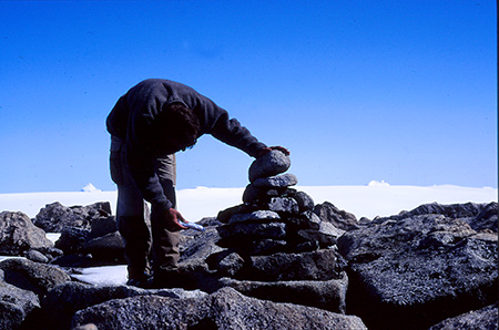 Construction d'un cairn et on y laisse un petit message roulé serré dans un tube de vitamine C.