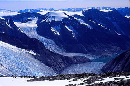 Du sommet, un plateau nous mène vers une vue plongeante sur le glacier Sermeq : cascade impressionnante de séracs qui viennent mourir dans le fjord. A 360° autour de nous, c'est la folie... une multitude de mondes différents s'entrechoquent... ça se plisse, ça s'élève vers le ciel en parois noires et abruptes, ça s'encapuchonne de lunes neigeuses, ça fjorde, ça file tout droit vers le nord en nous laissant là, ébahis, admiratifs et presque mystiques !