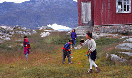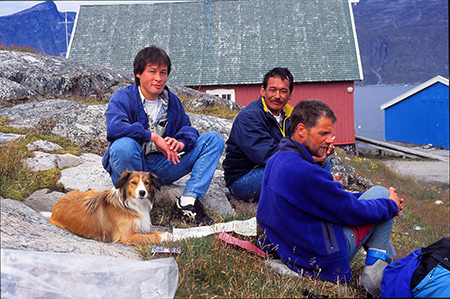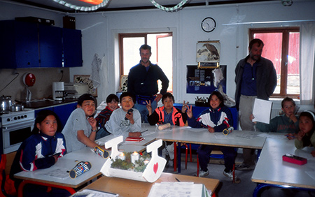 A 10h, on va à notre rendez-vous avec l'école d'Ammassalik où la classe des grands nous attendait... une dizaine de gamins, deux chiens, un coin cuisine, tout ça sent bon la convivialité. Et nous voilà partis pour une leçon trilingue. J'explique en français notre périple de 23 jours sur l'Isortoq et Bernard traduit en anglais à l'instit qui, lui, le rapporte en groenlandais. Les enfants retracent notre itinéraire sur une photocopie de carte. J'écris au tableau quelques dates et la hauteur des sommets qu'on a gravis. Passage obligé ensuite auprès de chacun pour laisser un autographe sur leurs feuilles... On embraye sur une série de chansons groenlandaises. Puis, leçon de vocabulaire. "Père, mère, phoque, stylo, école" sont traduits du groenlandais en français et réciproquement. Les enfants oralisent et mémorisent ces quelques mots. Ils les recopient et on passe dans les rangs pour corriger... Photo souvenir et c'est la récré pour eux et le départ pour nous. Super sympa cet épisode scolaire. Echange d'adresse de nos écoles respectives pour une correspondance future (Mes CM2 de Novéant leur ont envoyé des textes et dessins mais on n'a jamais eu de réponse... ).