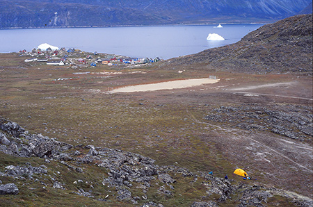 Un groenlandais nous appelle du pas de sa porte et nous invite à boire le café chez lui. Invitation qu'on accepte bien volontiers, café et poisson séché. Mais la conversation tourne court, le groenlandais est une langue assez hermétique ! L'Isortoq, il ne connait pas. Les groenlandais se contentent de pêcher dans le fjord et ne s'aventurent que rarement dans les terres où il n'y a rien à faire pour eux. Repas devant notre tente plantée à côté du terrain de foot.
