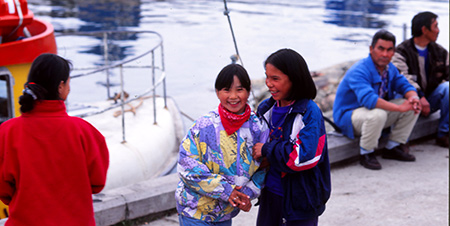Avec 1 heure et demi de retard, le Taterak accoste sur le petit ponton d'Ammassalik. Départ un peu émouvant, quelques enfants sont venus nous dire au revoir, avec un timide sourire. Je me souviens de ce pêcheur essayant de vendre quelques poissons aux membres de l'équipage et se faisant écraser le pied entre la coque et le ponton. Les yeux fermés de douleur, il emballe ses trois poissons contre 100 couronnes et repart à cloche pied... Le jeune rencontré hier nous salue... On quitte un endroit magique et le cœur se serre.