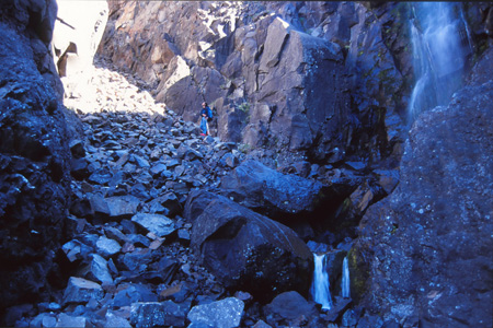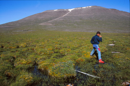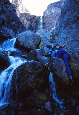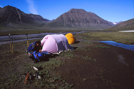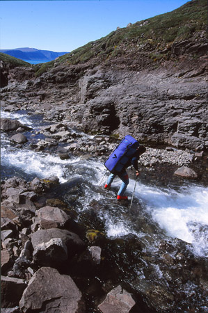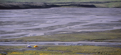 Franchissement du col (alt. 400m) et descente vers un nouveau monde : le monde des eaux et du fleuve échevelé dans son écrin vallée. Et pas un écrin anodin : une vallée emmanchée sur son fond de fjord, une vallée à fond plat pleine de rouleaux de sable, de mousse insondable délimitant de multiples écheveaux d’eau à la couleur brun rouge ou vert translucide, une vallée cernée de murailles verticales et… posées au beau milieu de tout çà… nos deux petites tentes !