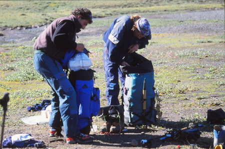 Toujours le camp 1. Une petite toilette pour me rappeler que je n’aime pas l’eau froide ! Beaucoup de scènes routinières pour cette fin d’après-midi. Ce soir, je trouve ces gestes un rien teinté d’ennuis… il faut peut-être réapprendre. Je crois que c’est l’action qui manque… alors, si c’est ça, c’est pour demain avec, au programme, un double portage. On déménage vers le Camp 2. C’est peut-être ça qui va nous soigner : Marc est bavard, Bernard cherche ses marques, Yannick, attentif, apprend et moi qui n’arrive pas encore à être concentré sur ce qui n’existe pas encore. Attendons demain. Pour l’instant, ce n’est qu’une mise en jambe et chacun attend d’une manière différente.