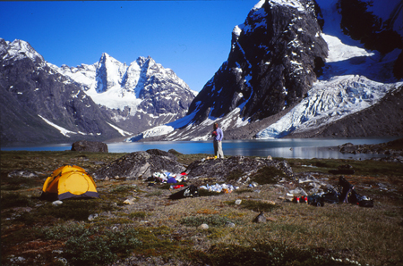 Mercredi 21 - 18h 30. Dernier petit dèj à la cafèt (café à volonté avec les délicieuses patoches habituelles...). Puis, pour moi, fouille d’un camion poubelle à la recherche de nos deux sacs de provisions qui s’y étaient retrouvés par mégarde pendant que Bernard sillonne Manitsoq en taxi à la recherche du dit camion poubelle... bref, la routine groenlandaise. Une bonne partie de tapecul sur le fjord d’Ikamiut à slalomer entre la houle, un dernier adieu, et voilà... le camp 1 est monté au bord du lac de Tasersuaq au milieu d’une nuée de moustiques plus sympa les uns que les autres...