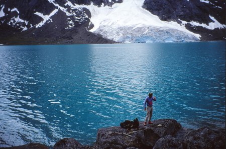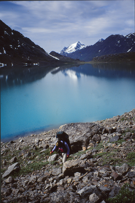 Double portage du C1 au C2. Marche pas très aisée pour longer le lac (éboulis et gros blocs), remonter un peu vers l’amont et attaquer la moraine de front, monter, monter pour échapper aux moustiques et mouchettes.