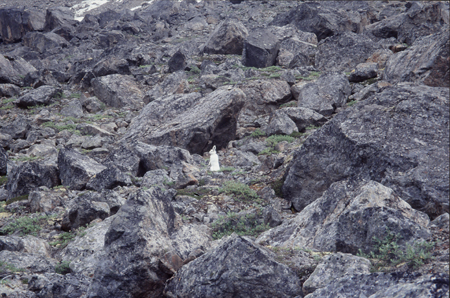 Décor très alpin. Les avalanches se sont déclenchées toute la journée. Les sommets sont recouverts d’une bonne quantité de neige fraîche. A cette heure, on se repose dans la tente. Le temps se couvre, euphémisme pour dire que des nuages déboulent d’un peu partout... Vu un aigle pêcheur au bord du fjord et un lièvre arctique dans la moraine.