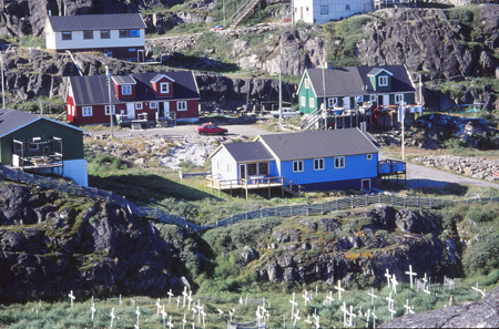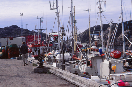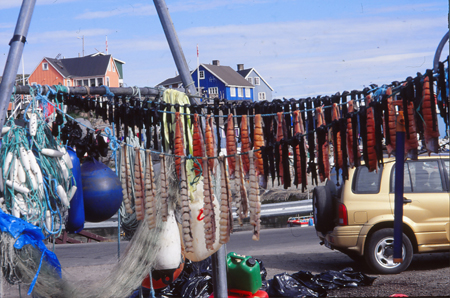 Lundi 19 - 13h 05. Toujours à la cafèt ! 17h. Plutôt que d’aller à contre courant et piétiner en pestant contre tout ce qui nous retarde, le fait de se laisser glisser avec le temps qui passe rend l’attente plus supportable. Une chaude et douce léthargie anesthésie le corps et l’esprit. Contact positif avec l’Office, un guide local pourra nous emmener en bateau au fjord de L’Eternité. Mais rien à faire tant que le mauvais temps dure. Alors on profite de quelques accalmies pour visiter Manitsoq accrochée à des rochers ruisselant de multiples cascades. Des maisons pilotis, de grands hangars, les éternels supermarchés, les cafés aux machines à sous, le port et le marché aux poissons.