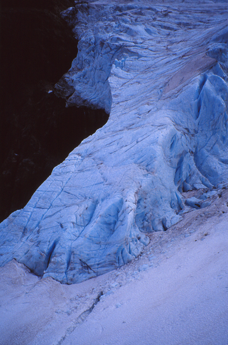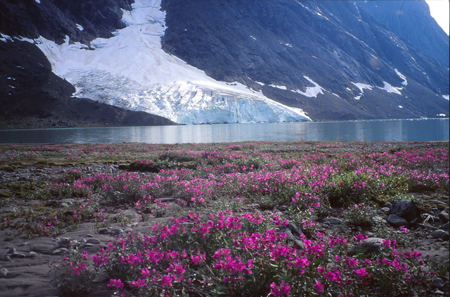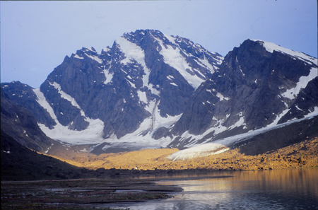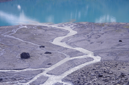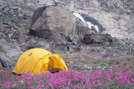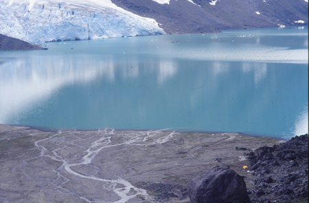 Dimanche 8. 10h 55. Camp 5. En attente... Le glacier de l’autre côté du lac n’arrête pas de secouer ses vieux séracs. Par l’abside ouverte, je viens d’avoir la vision d’un petit oiseau se poser sur un fond d’épilobes en pleine floraison et toujours en arrière plan la muraille bleutée du glacier qui sème quelques glaçons. Bernard fait des maths, je viens de nettoyer mes plaies en économisant le tulle gras. Quelques gouttes pas vraiment méchantes tambourinent de temps en temps sur la toile... Je pense qu’on va rester là aujourd’hui... le bateau vient nous chercher mercredi à 16 heures. En temps ordinaire, il resterait une petite demi-journée de marche. Mais le terrain instable et ces éboulis... me laissent présager quelques mauvais moments.