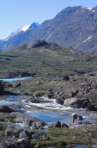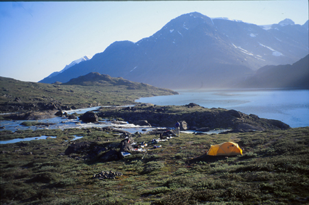 Trois heures de marche aujourd’hui, mais la jambe a bien souffert. Je ne crois pas que j’aurais pu faire plus. Ca s’est terminé par deux Nureflex et maintenant ça va mieux. Il y a une heure nous avons vu le premier bateau sur le fjord. Il a accosté dans une petite crique de l’autre côté du torrent... toujours émouvant cette première rencontre, même fugace avec ce que l’on a quitté. Il nous reste deux jours à attendre.