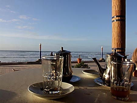 Tiznit (très coquette) et encore une dizaine de kms jusque Aglou Plage et l’hôtel avec chambre sur la mer (env 350dirams). Salade et omelette pour 70 dirams mangées au soleil sur la terrasse avec le premier thé à la menthe.