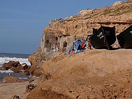 Jeudi 4 mars Volant bloqué le soir… et volant toujours bloqué le matin, bien sûr ! Le petit gardien de nuit du parking arrive à débloquer le Neimann mais la clé fissurée est maintenant bien tordu et ne m’inspire pas confiance. Retour à Agadir chez le loueur… Ken Mouchkin ! Pas de problème ! Bien sûr, j’avais oublié cette célèbre formule marocaine : Ken Mouchkin ! On repart au volant d’une autre voiture : 206 Peugeot ce coup-ci et en meilleur état que la précédente. Retour par le barrage Youssef : très beau parcours à travers une campagne verdoyante plantée d’arganiers. Pique-nique au-dessus de la retenue d’eau. Retour à Aglou Beach et balade à pied sur la plage, vers le Nord aujourd’hui jusqu’à un village de pêcheurs, royaume du plastique en tout genre ! Catastrophique, tout autant que la mer démontée.