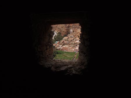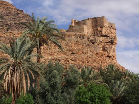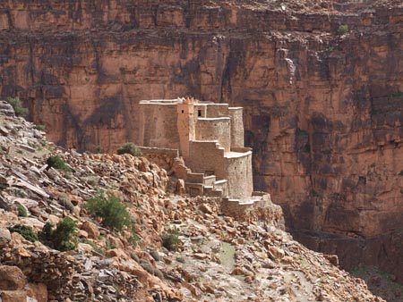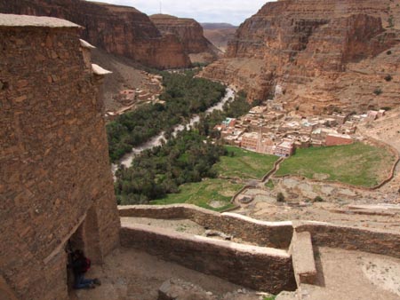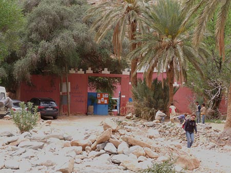 Vendredi 5 mars Départ de l’hôtel. On prend de l’essence à Tiznit où un passant me prend la main et se met à réciter "Sous le pont Mirabeau, coule la Seine…" et s’en va aussi sec avec un tonitruant "I’m not crasy ". Surprenant ! Belle route vers le Sud. Amtoudi et son merveilleux « Ondiraitlesud » qui n’est hélas libre que pour deux nuits alors qu’on voulait y rester trois jours. Belle petite chambre sur la terrasse. L’auberge est sise au pied d’une imposante falaise, au début des gorges.