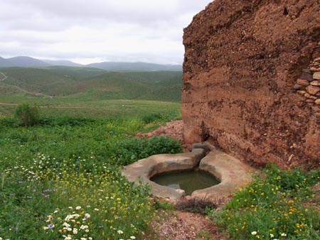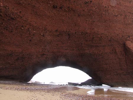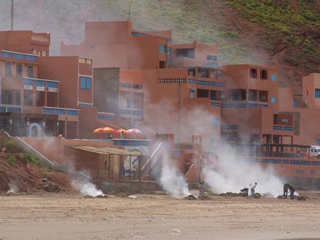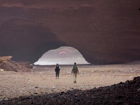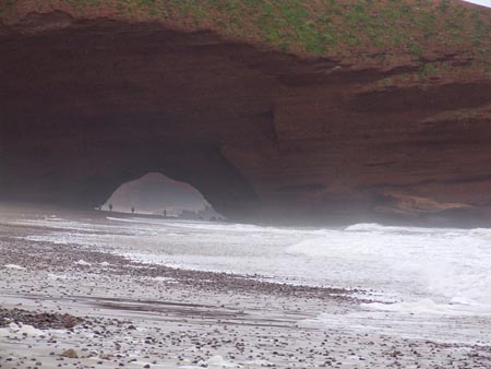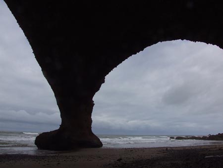 10 km au Nord de Sidi Ifni, des arches naturelles superbes. (dernière photo : nettoyage de la plage et brulage des ordures...) On prend en stop le bel anglais romantique… Boucle voiture pour l’après-midi : env. 80 km dans l’arrière pays. Trajet entièrement en macadam, contrairement à la version du Routard édition 2005. La campagne en fleurs mais sous un ciel gris et un peu pluvieux. Pique-nique en bord de route sous quelques gouttes.