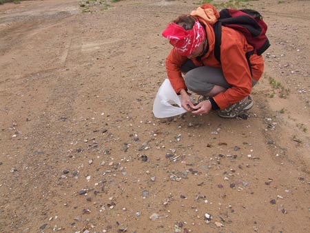 Mardi 9 mars Direction Foum Assaka puisque le macadam le permet maintenant. C’est comme un peu si le bout du monde devenait accessible. Plaine côtière désertique, quelques fermes isolées, un village de pêcheurs à l’écart de la route (Sidi Ouarsik), on ne s’y arrête pas. La route s’arrête au niveau de l’oued, à Foum Assaka, après c’est de la piste… donc pas pour notre petite voiture : « only 4X4 » comme le dit la pancarte. On continue à pied, le long de la mer. Site à silex sur une petite terrasse en rive gauche de l’oued.