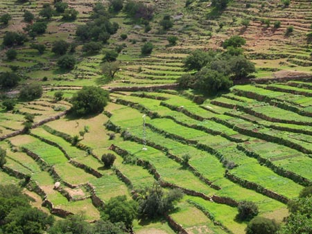La route s’élève doucement, le relief se marque et la montée vers un col est magnifique au milieu des terrasses cultivées qui montent jusqu’aux crêtes.