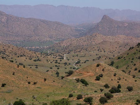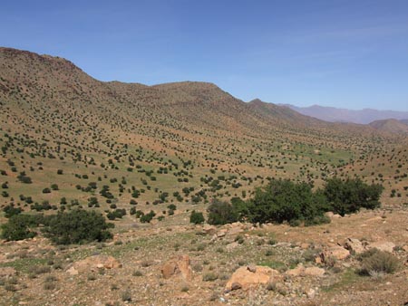 Mercredi 10 mars Dernier petit dèj à Sidi Ifni et dernière discussion avec toujours la même serveuse agréable qui nous donne deux adresses où dormir à Tafraout. Toujours un plaisir de conduire au milieu de ces paysages qui changent sans arrêt. Arrêt pipi au milieu des fleurs et des cactus : une tortue s’y promène. Traversée de Tiznit qu’on connaît maintenant et on file direct vers les montagnes qu’on aperçoit, brumeuses, à l’horizon.