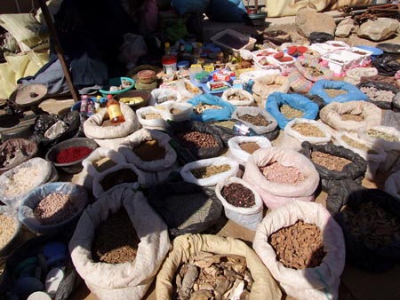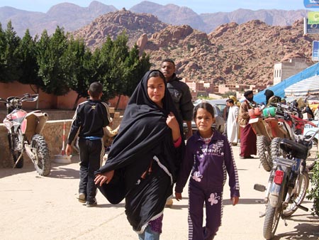 Arrêt thé à l’hôtel du col et descente sur Tafraout. Arrêt pique nique au bord d’un petit oued et la fin du trajet s’effectue dans un chaos de blocs de garnit aux formes les plus étranges les unes que les autres. Construite au milieu de ces blocs roses, Tafraout s’ouvre au fond d’une double avenue… ça grouille de monde : c’est le souk aujourd’hui.