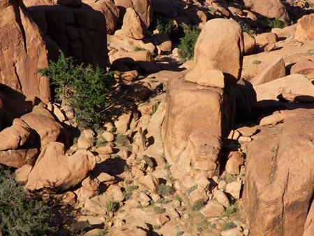 Un thé à une terrasse et direction la campagne pour une petite balade dans le dédale des blocs de granit. C’est un délice de serpenter dans ce chaos, on débusque une horde de sangliers au bord d’un point d’eau, on file jusqu’à une crête avec vue sur Tafraout et le soleil couchant.