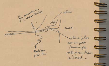 Belle balade en remontant un peu le cours de l’oued. Retour à Ifni pour le thé et les fameux beignets toujours aussi bons. Bonne adresse : juste en face de la poste… Plein d’essence pour demain et retour à l’hôtel. Douche et tentative de téléphoner à Tafraout pour réserver un hôtel : chambre dispo uniquement jeudi et vendredi… pour mercredi, on improvisera sur place ! Couscous à l’hôtel toujours aussi sombre et tranquille. Serveuse toujours aussi bavarde qui nous parle de l’huile de figue de barbarie, nouveauté cosmétique et qui est en même temps une des huiles les plus chères…
