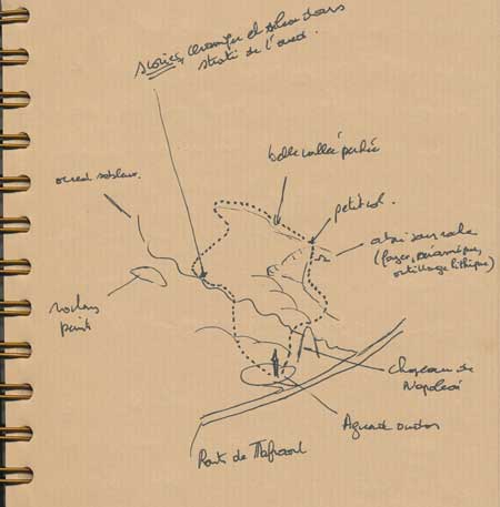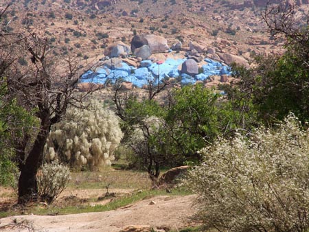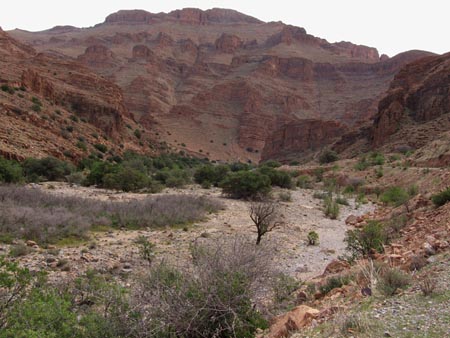 On laisse la voiture sur le parking somptueux de ce petit douar : pavés autobloquants, lampadaires digne d’une capitale…). On ne prend pas la piste qui mène aux blocs peints mais on monte sur la crête qui ceinture le village pour descendre de l’autre côté. On traverse un oued sableux et une zone bien verte avec beaucoup d’enclos. On se faufile ensuite dans une petite vallée qu’on remonte jusqu’à un col. Dans la montée, sur le versant gauche d’un petit filet d’eau, un abri sous roche avec un reste de foyer et une belle couche noire qui livre de nombreux tessons décorés, des silex, divers aménagements délimités par des pierres.